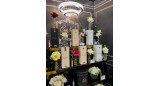 и вид. Композиция помещена в прозрачную, элегантную вазу с золотой эмблемой.